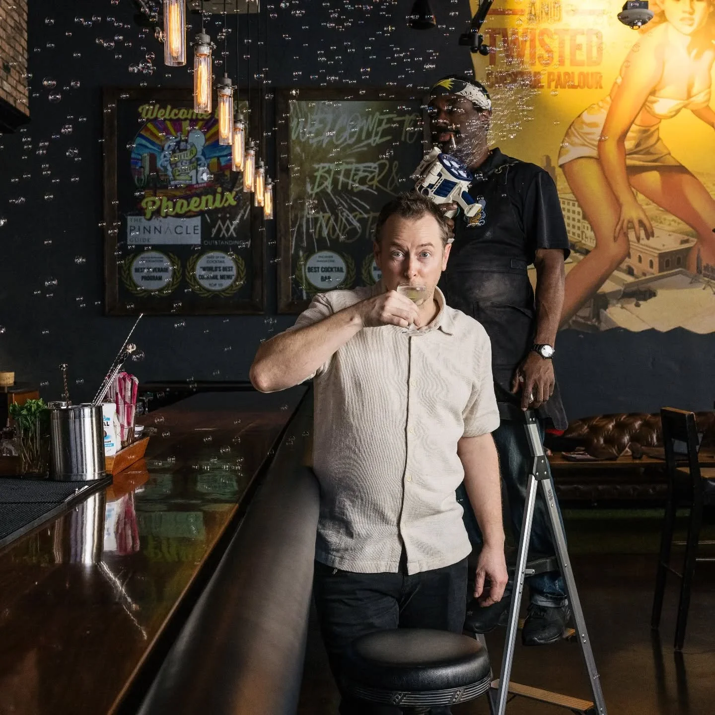 Step into the historic Luhrs Building in downtown Phoenix, once home to the former Arizona Prohibition Headquarters, now a fittingly ironic setting for one of the best cocktail bars in Phoenix. At Bitter & Twisted, we take pride in crafting award-winning cocktails that push the boundaries of creativity while delivering impeccable service and warm hospitality to all who walk through our doors. Recognized globally for our innovative approach, we’ve earned the accolade of 2 Pins on the Pinnacle Guide, making us a must-visit destination for any cocktail enthusiast.