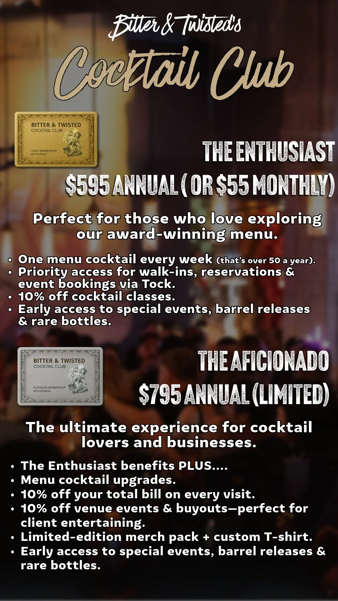 Each of the two annual membership tiers are available in limited quantities so act fast: The Enthusiast tier is ideal for anyone who appreciates expertly crafted drinks, great hospitality, and exclusive perks. For those seeking a premium level of access, the Aficionado tier, tailored to businesses, delivers exceptional benefits, making it a smart choice for entertaining clients or hosting events at Bitter & Twisted, while enjoying significant value on every visit. Something you definitely don't find anywhere these days.